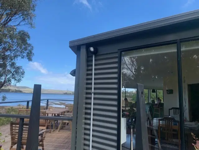With high winds, salty air, and wide exposure, the location demanded a tough and reliable setup. We installed multiple weather-resistant security cameras around the home’s exterior, all mounted with UV-stable conduit and fixed neatly to the steel cladding. Each camera covers key angles, including the expansive deck, side access points, and the bushland boundary.